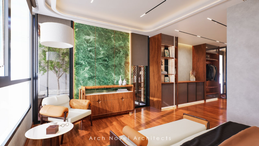 ကျွန်မတို့အနေနဲ့ သာမန် Modern Design မျိုးမဟုတ်ဘဲ… ✅ သစ်သား၊ သားရေ၊ သတ္တု နဲ့ အထည်အလိပ် (Wood, Fabric, Leather, Metal) တွေကို သေသေသပ်သပ် ပေါင်းစပ်ထားပြီး၊ ✅ ပရိဘောဂ (Furniture) တစ်ခုချင်းစီကိုလည်း Client စိတ်ကြိုက် အသေးစိတ် (Custom-made) ဖန်တီးပေးထားပါတယ်။